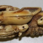 A Japanese carved ivory netsuke, Meiji period, modelled as three rats clambering over a pumpkin and wicker basket, length approx 5.5cm (some faults).