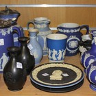 A Wedgwood blue dip jasperware jug with pewter tappit lid and collar, late 19th Century, the tapering body ornamented in white with a band of fruiting vines above classical figures, impressed factory mark to base, together with a collection of Wedgwood jasperware, basalt and other jasperware, including vases and jugs (some faults).