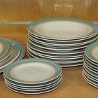 A Royal Worcester part dinner service, circa 1896-1912, decorated with turquoise and brown printed banding, comprising a tree and well meat platter, five graduated meat platters, two oval vegetable tureens and covers, two sauce tureens, covers and one stand, six dinner, ten dessert, five side and five soup plates, puce and green printed factory marks including some with 'Manufactured for William Whiteley, Westbourne Grove, London' (minor faults).