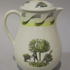 A collection of Wedgwood Garden pattern teaware, designed by Eric Ravilious, comprising hot water pot and cover, sugar bowl, five egg cups, teacup and two saucers, four dessert plates and six sideplates, with black printed decoration and heightened in yellow, printed factory marks to bases (some faults).