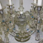 A cut glass four light candelabra, 20th Century, each scroll branch terminating in a drip tray and sconce, hung with clear and blue glass drops and festoons, on a knop stem and circular foot, height approx 54cm (minor faults).