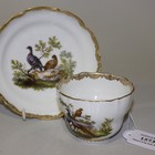 A Meissen porcelain cup and saucer, 19th Century, each painted with birds in a landscape within gilt overlaid borders, cancelled crossed swords in underglaze blue to bases, height of cup approx 6cm (minor restoration to saucer).