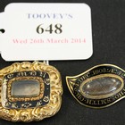A gold and black enamelled mourning brooch of scroll oval form, glazed with a hair locket compartment at the centre, detailed to the border 'Thos Smith. Ob: 24. Dec. 1808. Ae: 52', length approx 3cm, and a rectangular black enamelled mourning brooch, the central locket compartment vacant, detailed to the border 'In Memory Of', engraved in script at the back 'H Vernon Ob. 5. Feby 1832. Ae: 34', length approx 3cm.