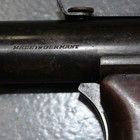 A .177 Haenel Model 28 air pistol with break barrel, length approx 10cm, and barleycorn front sight, cylinder impressed with patent details and mounted with screw adjustable rear sight, trigger guard operated cocking, plain walnut grips with inset brass discs embossed 'Haenel' (part refinished).