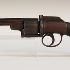 A 120 bore six shot percussion transitional revolver with rifled octagonal barrel, length approx 10.5cm, rounded foliate scroll engraved frame, bar hammer, chequered walnut grips (defective, sideplate replaced, worn overall, one nipple loose).