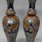 A pair of Royal Doulton stoneware baluster vases, early 20th Century, by Mark V. Marshall, each tube lined with brown and blue scroll decoration against a mottled green ground, impressed factory marks, incised artist's initials and No. '591' to bases, height approx 44cm (both with repaired necks).