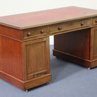 A late Victorian mahogany twin pedestal desk, the moulded top inset with gilt-tooled red leather above three drawers and a pair of cupboard doors, the plinth bases raised on castors, width approx 150cm, depth approx 78cm.