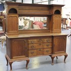 A George V oak sideboard, the mirrored back fitted with a shelf and cupboards, the base with three central drawers flanked by a pair of panelled doors, on cabriole legs and pad feet, height approx 196cm, width approx 201cm.
