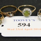 A gold, platinum, peridot and diamond set circular cluster ring, detailed '18ct Plat', a 9ct gold and diamond set single stone ring, mounted with a circular cut diamond, a gold ring, mounted with a cushion shaped diamond, and a 9ct gold, diamond and pale green gem set three stone ring.