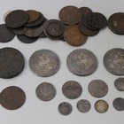 Three George III crowns, three shillings, comprising George III, George IV and Victoria Young Head 1883, four further silver coins, a George III Cartwheel twopence 1797, a Chichester halfpenny 1794, a Roman denarius depicting a galley, and twenty further mostly copper and bronze coins and tokens.
