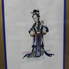 A pair of Chinese Canton export watercolour paintings on rice paper, mid-19th Century, each depicting a standing maiden wearing colourful costume, approx 25cm x 16cm, framed and glazed, together with a group of three similar watercolours on rice paper, each depicting a scene of two figures, approx 16cm x 24cm, framed and glazed.