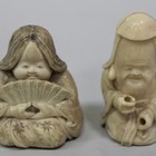 A Japanese carved ivory netsuke, Meiji period, modelled in the form of a seated girl holding a fan in front of her face, height approx 4.5cm, together with a carved ivory netsuke in the form of Fukurokuju, height approx 5cm.