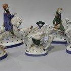 A collection of four Rye pottery equestrian figure groups, and another of two greyhounds.