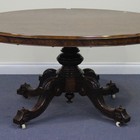 A Victorian burr walnut oval tip-top breakfast table, the moulded top above a carved and turned knop stem, raised on four downswept legs terminating in china castors, length approx 152cm, width approx 113cm.