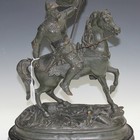 A late 19th Century spelter figure of a knight on horseback, on an ebonized oval plinth base, height approx 37cm.