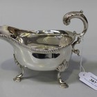 A late George II silver sauce boat with gadrooned rim and foliate capped flying scroll handle, on scallop shouldered scroll legs and stepped hoof feet, London 1756, length approx 17cm.