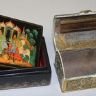 A Russian papier-mâché rectangular box and cover, 20th Century, the cover painted with a scene of a soldier and horse greeting three maidens, length approx 8cm, together with a brass vesta case in the form of a trunk.