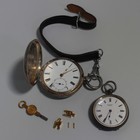 A silver hunting cased fob watch, London 1859, with a leather fob strap, a silver cased open-faced lady's fob watch with a gilt cylinder movement, the enamelled dial with black Roman numerals, detailed 'La Fidele Geneve', a watch key, and two links from a lady's wristwatch bracelet.