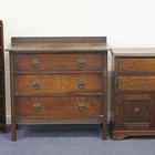 A George V oak chest of drawers, another chest of two drawers above a cupboard and an oak bookcase.