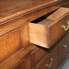 A late George III oak dresser base, fitted with an arrangement of six drawers and two arched panel doors, raised on shaped bracket feet, height approx 93cm, width approx 158cm (alterations and restoration).