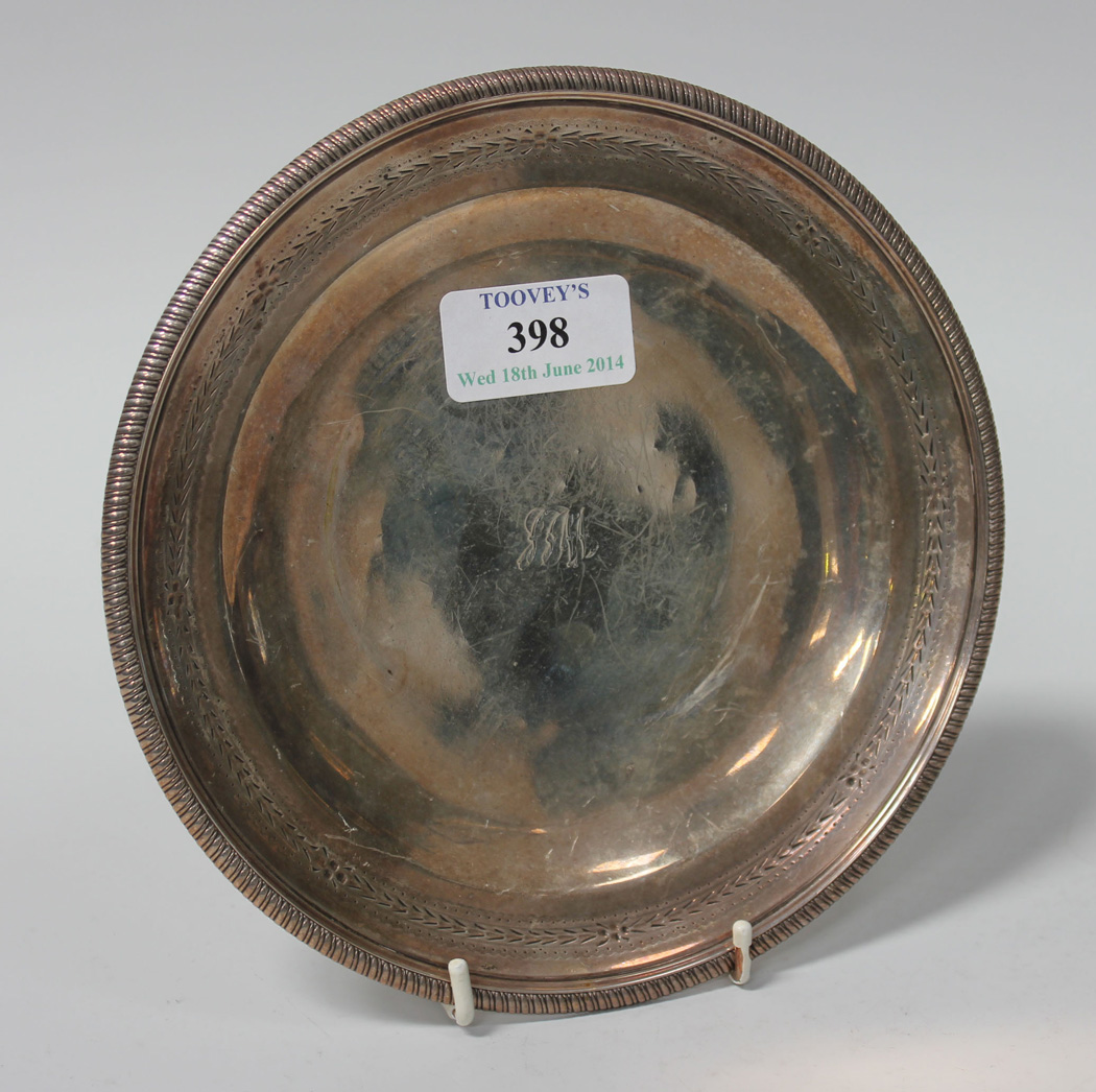 A George III silver circular dish engraved with a band of leaves within a gadrooned rim, London 1805 by Thomas Wallis II, diameter approx 18cm.