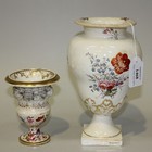 A Derby porcelain vase, early 19th Century, the ogee body painted with floral sprays, on a square base, painted factory mark including '33' and impressed 'No 138' to base, height approx 21.5cm, together with a porcelain urn shaped vase decorated with a biscuit floral band above painted sprays of flowers, on a circular foot, height approx 12cm (faults).