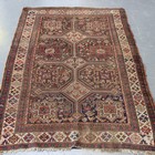 A Khamseh rug, South-west Persia, early 20th Century, the midnight blue field with three linked cruciform medallions supported by birds and guls, within an ivory gul border, approx 178cm x 128cm.
