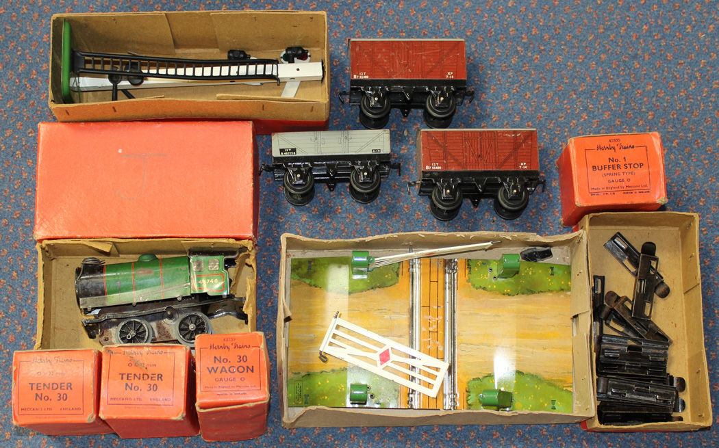 A small collection of Hornby Trains gauge O items, including a No. 30 locomotive, two tenders, goods rolling stock, a No. 2 double signal arm and track, some boxed (playwear, faults, boxes creased, torn and scuffed).