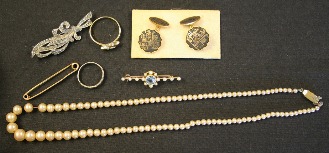 A gold, seed pearl and pale blue gem stone set bar brooch, detailed '15ct', a gold plain tie pin bar, detailed '9c', a marcasite ring, a marcasite brooch, a pair of gilt cufflinks, decorated with ancient Egyptian style motifs, an imitation pearl necklace and a costume ring.
