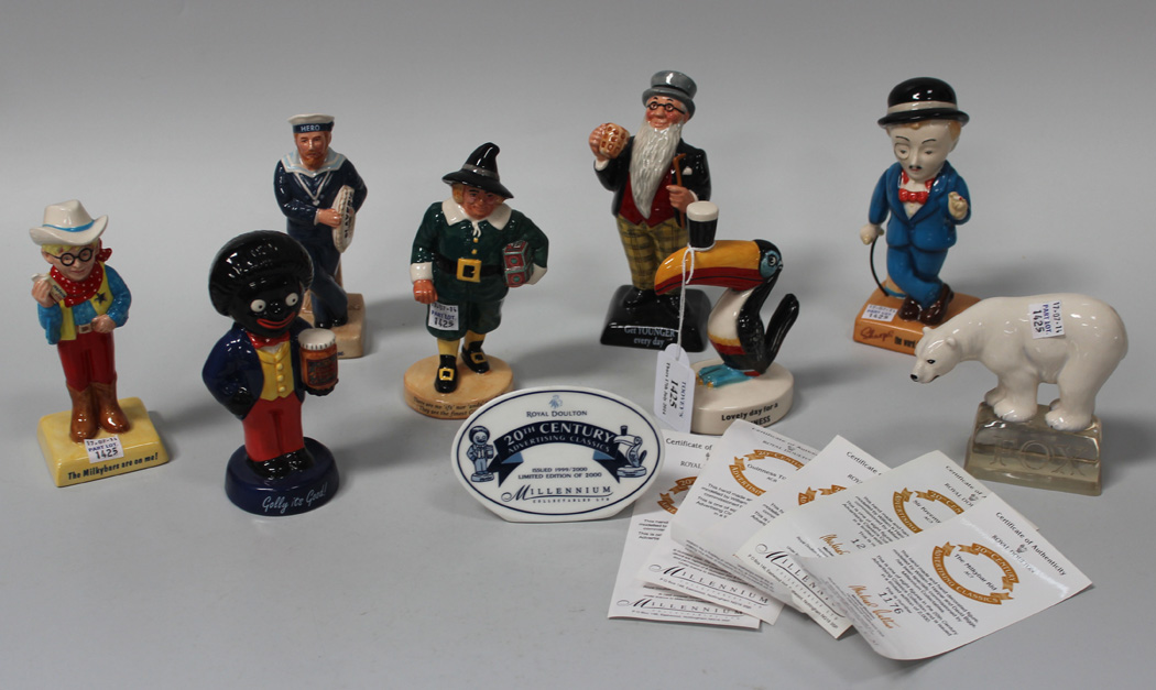A set of eight Royal Doulton limited edition 20th Century advertising classics figures, comprising 'Golly', AC1, 'Father William', AC2, 'Sir Kreemy Knut', AC3, 'Fox's Polar Bear', AC4, 'Players Hero', AC5, 'John Ginger', AC6, 'The Milkybar Kid', AC7, and 'Guinness Toucan', AC8, each from an edition of 2000, all boxed and five with certificates, together with matching plaque.