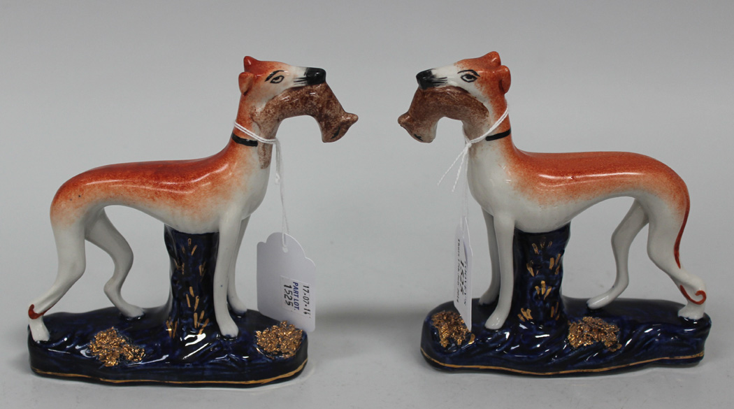 A pair of Staffordshire pottery greyhounds, early 20th Century, each modelled standing with a hare in its mouth on a naturalistic blue washed base with gilded decoration, height approx 14.5cm.