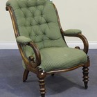 A Victorian walnut scroll armchair, upholstered in green fabric, on turned legs with brass caps and castors, width approx 72cm.