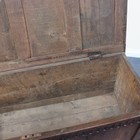A late 17th Century oak panelled coffer, the hinged lid above a stop fluted frieze and a four panel front, on stile supports, height approx 70cm, width approx 152cm (some alterations).