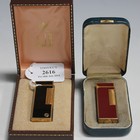 A Dunhill black enamelled and gilt metal lighter, cased, together with a similar lighter with burgundy enamel finish.