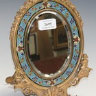 A late 19th Century gilt bronze and champlevé oval dressing table mirror, the frame with a cartouche and rose garland surmount, the scrollwork stand with figural and mask mounts, the back with hinged strut, height approx 28.5cm.
