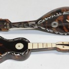A late 19th Century Neapolitan tortoiseshell diminutive model of a mandolin with mother-of-pearl inlaid decoration, length approx 13.5cm, and a diminutive model of a guitar, length approx 13.5cm (faults).