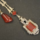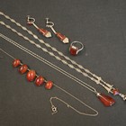A cornelian and marcasite set pendant necklace, the front in a panel shaped drop shaped design in the Art Deco taste, a pair of cornelian and marcasite set pendant earrings, the tops with screw fittings, a cornelian panel shaped single stone ring, a cornelian five stone necklace, and a cornelian single stone pendant with a neckchain.