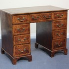 An early 20th Century George III style burr walnut twin pedestal desk, the top inset with gilt-tooled brown leather above eight drawers, on bracket feet, height approx 84cm, width approx 108cm.