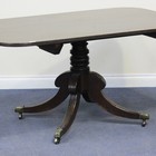 A George IV mahogany tip-top breakfast table, the rectangular top above a turned stem, on downswept sabre legs, terminating in acanthus cast caps and castors, width approx 149cm.