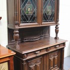 An early 20th Century French oak buffet, the moulded pediment above a pair of stained and leaded glass doors, each door centred with an enamelled dragon, the open shelf section above two drawers and a pair of carved panel doors, on a moulded plinth base, height approx 219cm, width approx 144cm.