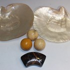 Two ivory billiard balls, a composite billiard ball, two mother-of-pearl shells and a tortoiseshell box and cover (faults).