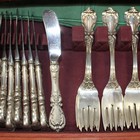 An American sterling part canteen of cutlery, each handle decorated with flowers and foliate scrolls, comprising twelve table knives and forks, twelve soup spoons, twelve dessert forks, twelve butter knives, twelve teaspoons, a cake slice and two serving forks, by Reed & Barton, cased, together with a .925 silver handled carving knife and fork by Kirk & Son Co.