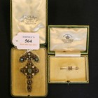 A foil backed garnet, cultured pearl and gem set pendant cross, probably Austro-Hungarian second half 19th Century, length approx 7.5cm, cased, and a gold and seed pearl set lace pin with an initial 'M' motif, detailed '9ct', cased, the case front having a Continental crown above an 'R' motif.