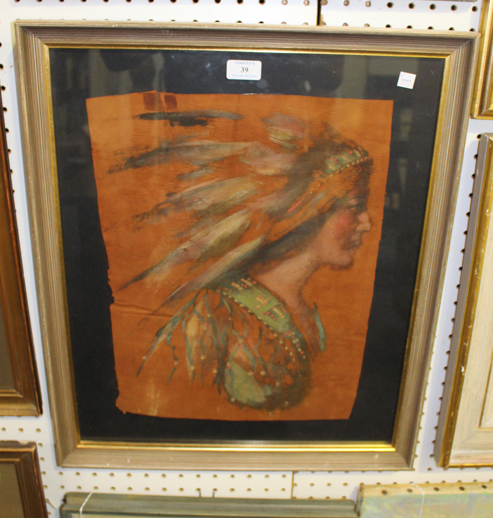 American School - Head and Shoulders Portrait of a Native American, mixed media on leather, approx 45cm x 34cm, within a painted and gilt frame.