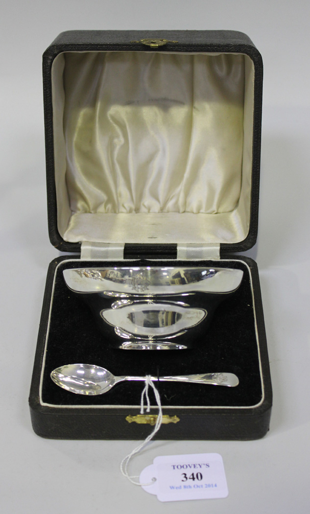 A George V silver and Bakelite lined christening bowl of circular ogee form, and spoon, Birmingham 1935 by Joseph Gloster Ltd, diameter of bowl approx 11.2cm, cased.