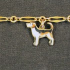A gold and enamelled charm bracelet, fitted with six gold and enamelled charms, comprising a cottage, gate, dog, fox, horse and huntsman.
