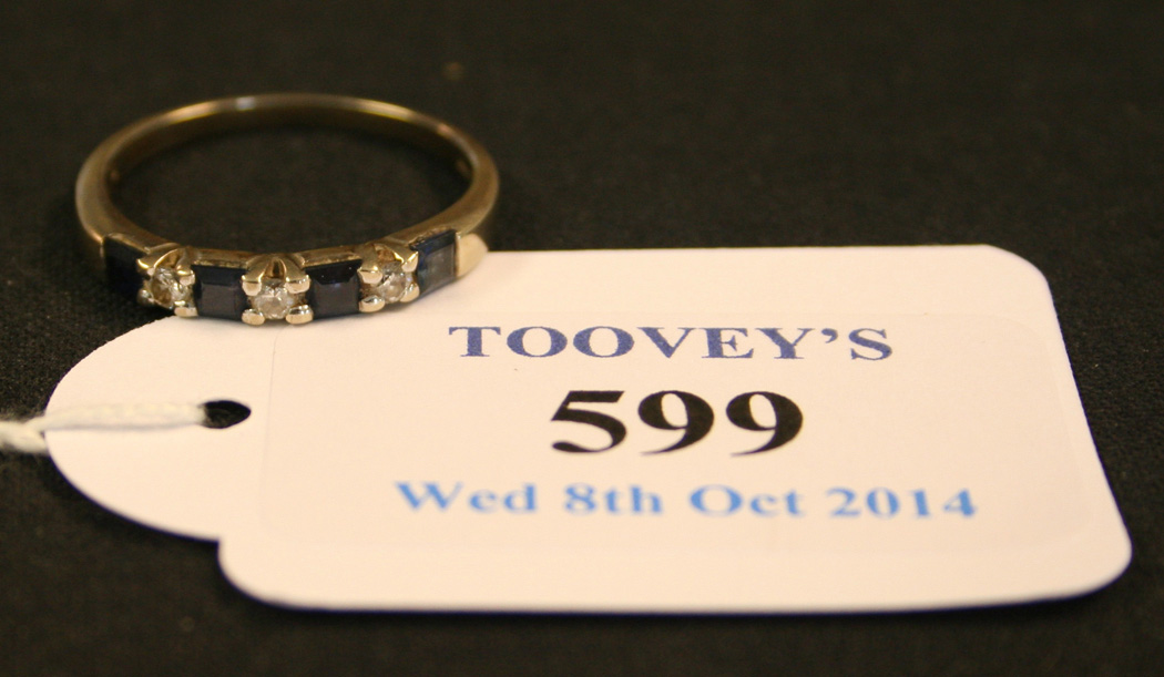 An 18ct white gold, sapphire and diamond set seven stone ring, mounted with four square cut sapphires alternating with three circular cut diamonds.