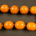 A single row necklace of sixty-three graduated oval mottled opaque butterscotch coloured amber beads, gross weight approx 394g, total length approx 175cm, length of largest bead approx 2.8cm, length of smallest bead approx 1.8cm.