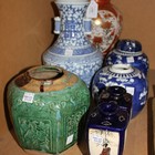 A Japanese Kutani porcelain vase, Meiji period, painted with birds and flowers, height approx 29.5cm, a pair of Japanese Satsuma earthenware vases and a small group of Oriental items.
