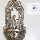 A German .800 silver holy water stoop, embossed with an arch of cherubs above the Virgin Mary and Baby Jesus, length approx 13.7cm.